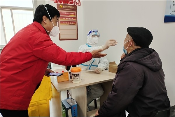 在东营经济技术开发区金水北区核酸采样点,红柳花志愿服务队志愿者辅助医务人员核酸检测、维持现场秩序。