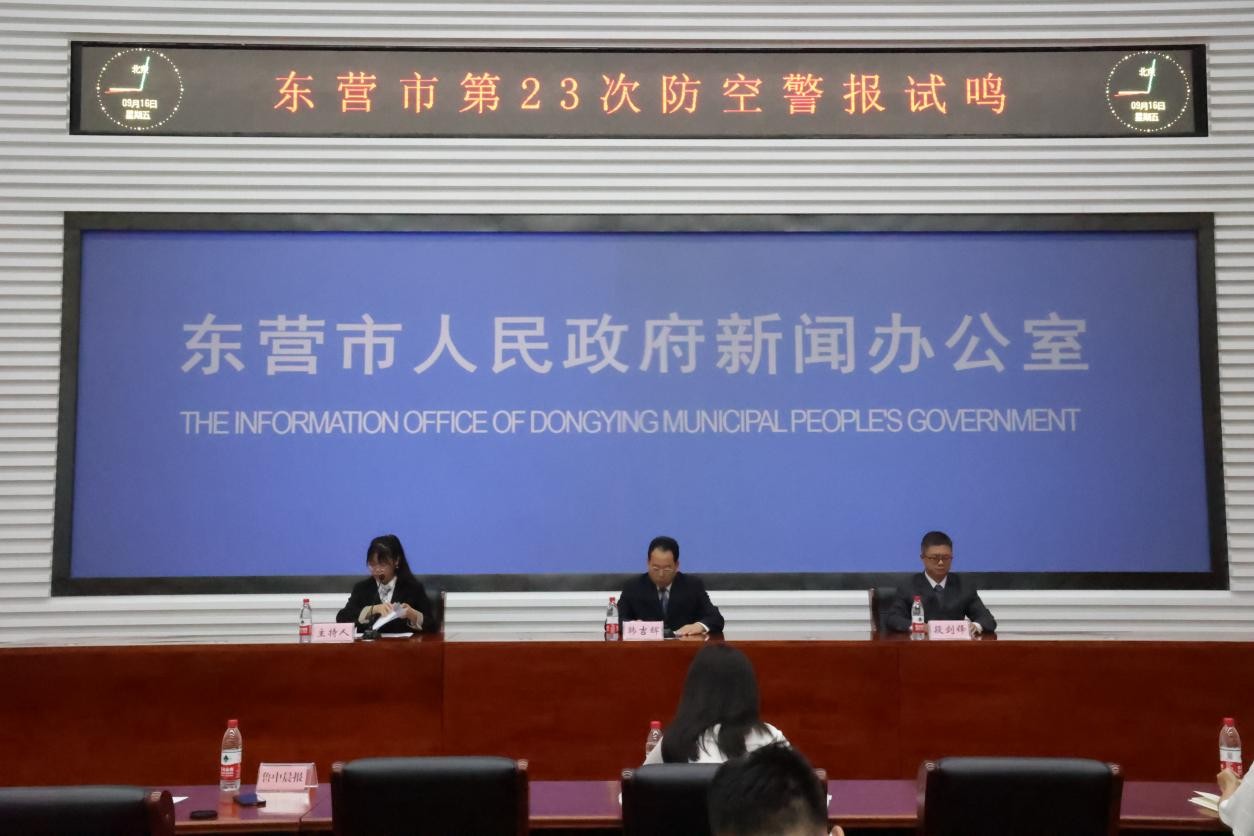 9月16日上午,东营市政府新闻办公室组织召开新闻发布会。东营市人防发展服务中心副主任韩吉辉、市人防发展服务中心综合科科长段剑锋参加新闻发布会,介绍东营市第23次“9·18”防空警报试鸣系列活动的具体安排情况并回答记者提问。