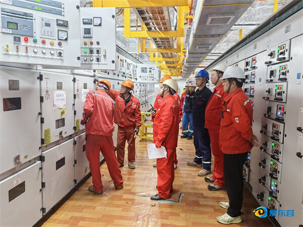 位于东营港的前沿增压平台变电站内,送电人员对电气设备进行送电前的检查。