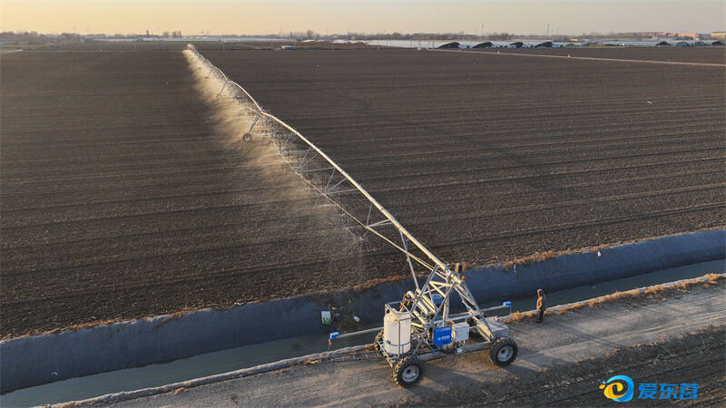 时值大雪节气,在广饶县李鹊镇安里村的农田里,桁架式喷灌机正在浇灌冬小麦。
