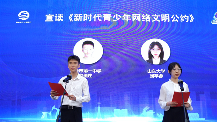 山东大学学生刘芊睿、东营市一中学生赵墨庄上台宣读《新时代青少年网络文明公约》。