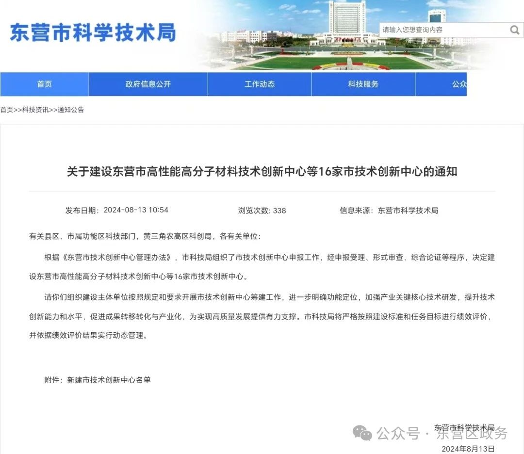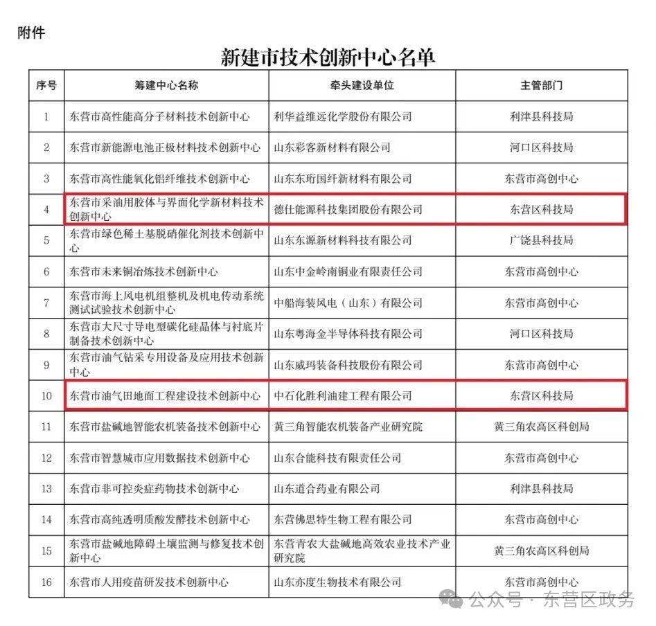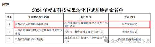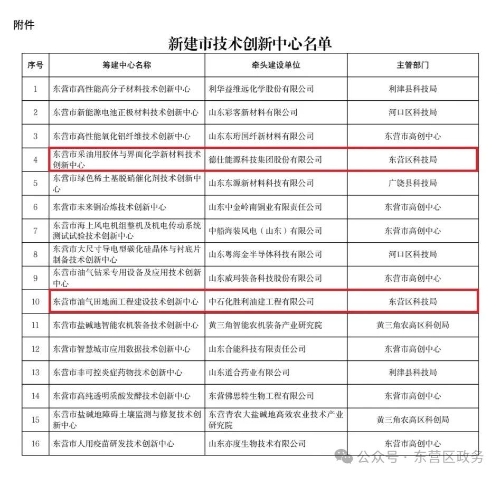 近日,东营市科学技术局下发《关于建设东营市高性能高分子材料技术创新中心等16家市技术创新中心的通知》《关于公布2024年度东营市科技成果转化中试基地备案名单的通知》,东营区的东营市采油用胶体与界面化学新材料技术创新中心、东营市油气田地面工程建设技术创新中心等2家市技术创新中心获批建设,东营市多波地震勘探中试基地予以备案。