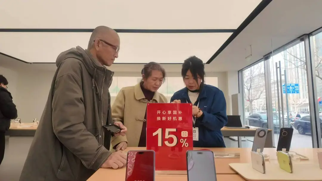 在广饶县华为授权体验店内3C产品消费券补贴的宣传标语十分醒目,悬挂在店内各个显眼之处。不少消费者借此机会升级电子产品。销售顾问正在为陈女士介绍购置手机的补贴政策。