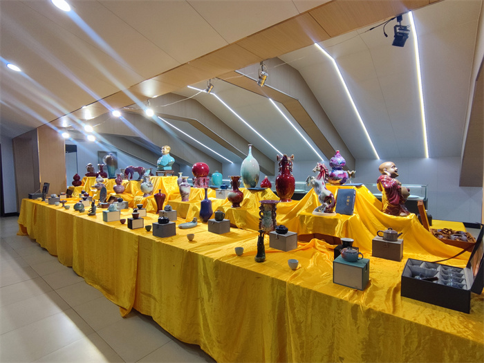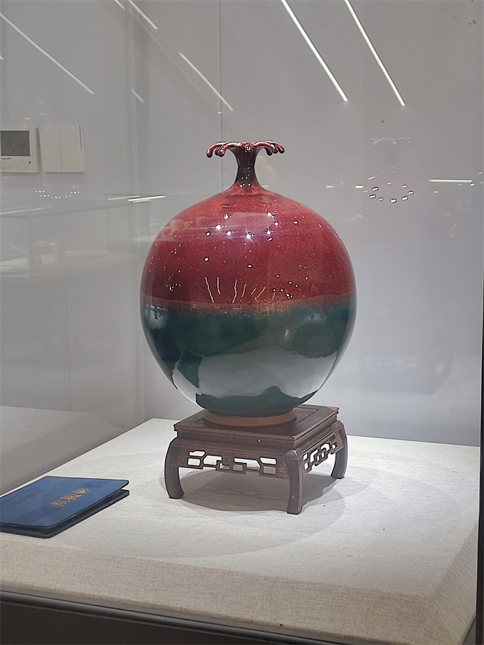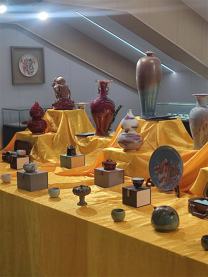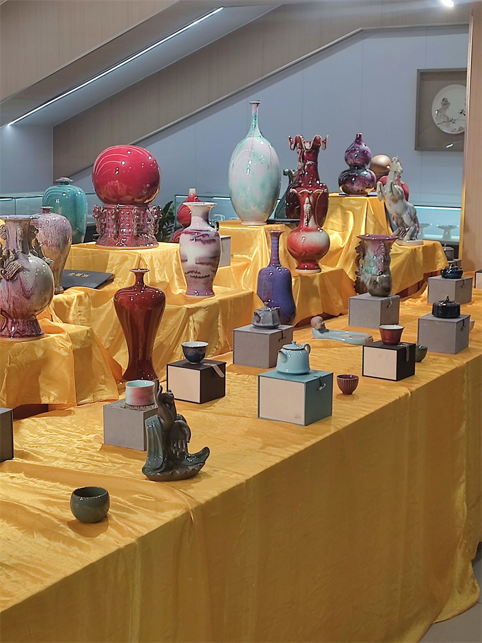 本次展出的100余件作品,涵盖器皿、摆件等多元形制,既传承宋钧的典雅神韵,又融入唐钧的凝重、元钧的粗犷与明钧的飘逸,将黄河文化的雄浑大气与钧瓷艺术的精巧灵动完美融合。代表作中,釉色流淌如星河的《碧海霞天》、兼具“雨点纹”与“蚯蚓走泥纹”的《石榴瓶》等作品,不仅展现“霁霞映空,云开天工”的视觉美感,更蕴含“风调雨顺迎盛世”的美好寓意,生动诠释了薛绍许“钧瓷有生命,开片日日新”的创作理念。