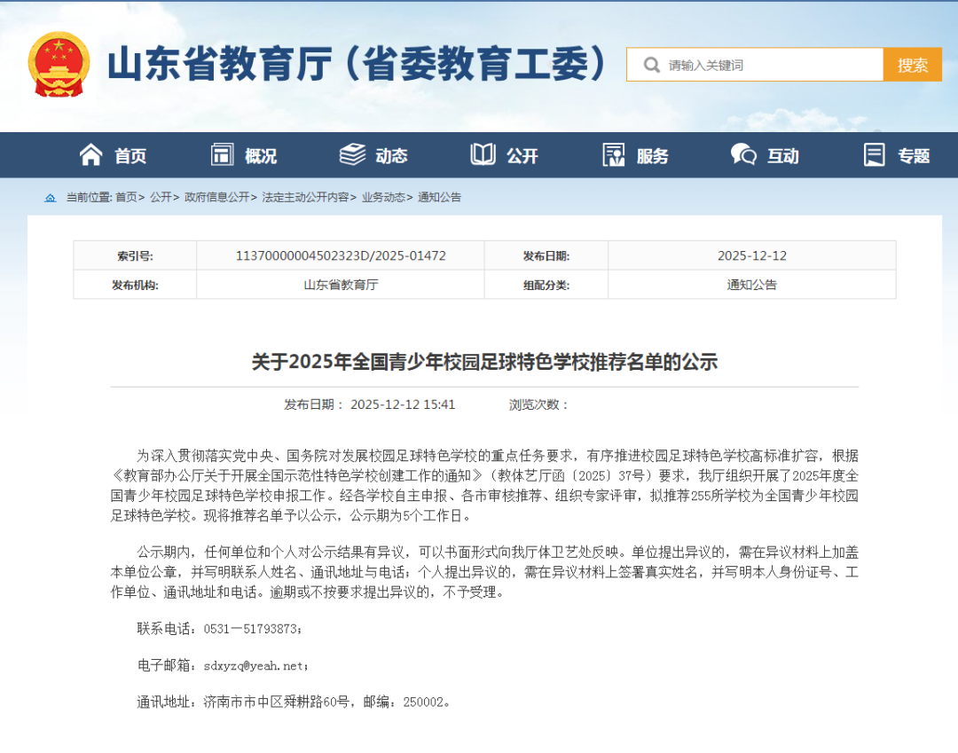 近日,山东省教育厅对2025年全国青少年校园足球特色学校拟推荐名单进行公示。东营市喜传捷报,在全市申报的11所学校中,共有10所成功入选,入选率高达91%,交出了一份校园足球发展的靓丽答卷。这10所学校分别是:东营市东凯第二小学、东营市清风小学、东营市胜利第五十八中学、东营市东营区行知实验学校、东营市胜利科技小学、东营市垦利区第一实验小学、东营市垦利区第三实验学校、利津县永利小学、北京师范大学东营实验学校、黄河三角洲农业高新技术产业示范区实验学校。