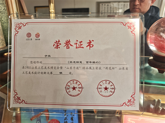 2025年12月29日,在济南舜耕国际会展中心举行的2025山东工艺美术博览会暨“山东手造”精品展上,山东省企业文化学会文化艺术研究院东营分院副秘长,东营卓彩工艺美术画加工基地总经理王强创作的铜雕作品铜雕艺术画《莲台瑞相》凭借精湛的铜雕工艺技术与独特的创作内涵,成功摘得“荷花杯”山东省工艺美术设计创新大赛金奖。东营卓彩工艺美术画加工基地于兵作品《非遗铜笺 百年婚约》斩获此次博览会银奖。