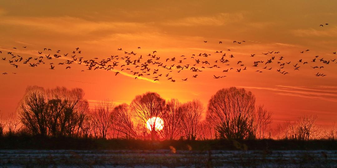 (黄河口的冬日里,成群的鹤类、天鹅、大雁在飞过夕阳,形成一幅诗意画面。 通讯员 赵文昌 摄)