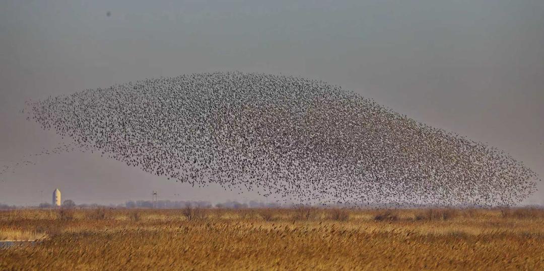 “起来啦!”2025年10月末,东营市滨海大道观鸟驿站,来自北京的摄影爱好者们的齐声惊叹,成为今冬黄河口“鸟浪”的首个网红热词。数十万只花脸鸭从山东黄河三角洲国家级自然保护区振翅腾空,宛若灵动流云,阵型变化多端,自天际由远及近。鸟群掠过游客头顶,振翅声交织成潮,如浪花拍岸,似千军过境。最令游客沉醉的,是鸟群时常幻化出惟妙惟肖的鲸鱼形态,头部、尾鳍、胸鳍轮廓清晰,凌空遨游的模样,恰如庄子《逍遥游》中“其翼若垂天之云”的意境照进现实。