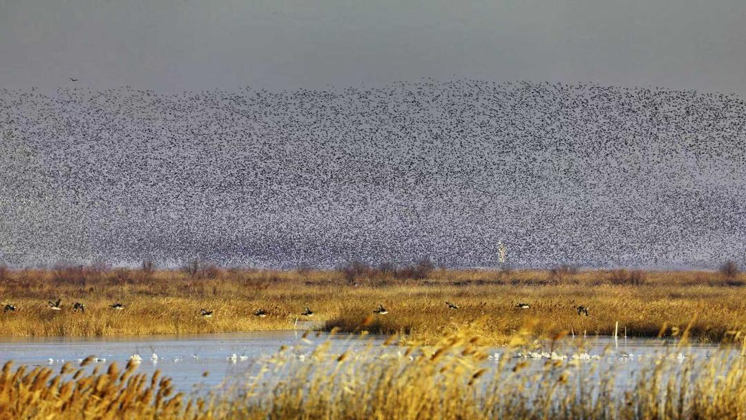 (黄河三角洲国家级自然保护区内成群的花脸鸭、针尾鸭组成的鸟浪掠过忙忙的芦苇荡。 通讯员赵文昌 摄)