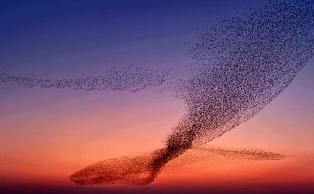 (鸟浪在夕阳下形成了壮观的鲸鱼形状,仿佛神话变为现实。 通讯员郭雨晴摄)
