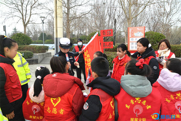 交警向身着“东营志愿者”红色马甲的青少年们进行讲解,传递安全知识与志愿精神。