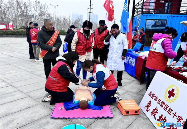 红十字会的志愿者现场开展应急救护技能培训。
