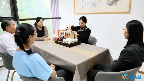 茶艺老师正指导几位居民练习倒茶手法。以前总觉得退休后心里空落落的,现在经常来书院喝茶聊天,认识了很多志同道合的新朋友。尹阿姨一边熟