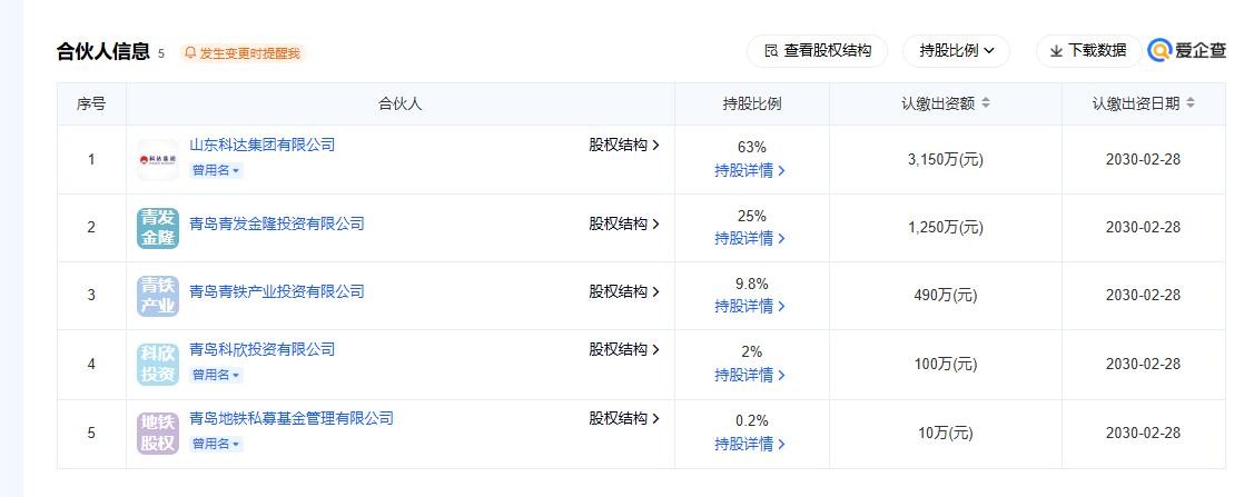 据爱企查,3月12日,青岛青铁科欣创业投资基金合伙企业(有限合伙)成立,合伙人包括山东科达集团有限公司(下称“科达集团”)、青岛青发金隆投资有限公司、青岛青铁产业投资有限公司、青岛科欣投资有限公司、青岛地铁私募基金管理有限公司。