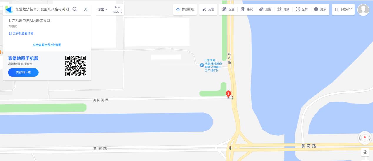 地图查询可知,东营经济技术开发区东八路与浏阳河路交叉路口附近的厂房为山东国瓷功能材料股份有限公司第二工厂。