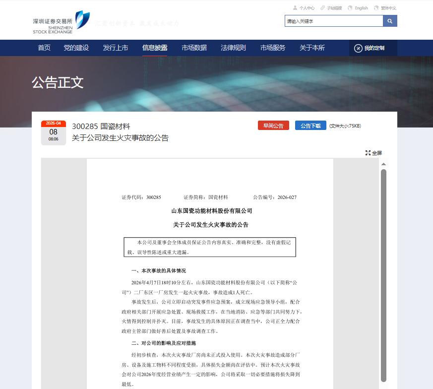 随后,4月8日,山东国瓷功能材料股份有限公司(以下简称“国瓷材料”)于深圳证券交易所发布《山东国瓷功能材料股份有限公司关于公司发生火灾事故的公告》,明确说明本次事故的具体情况,即2026年4月7日18时10分左右,山东国瓷功能材料股份有限公司二厂东区一厂房发生一起火灾事故,事故造成1人死亡。