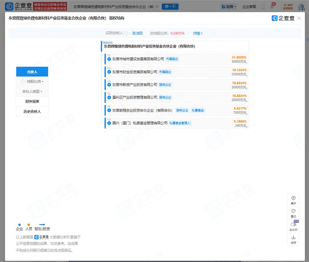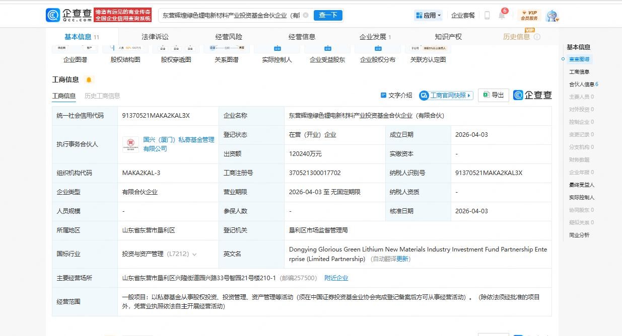 据企查查,近日,东营辉煌绿色锂电新材料产业投资基金合伙企业(有限合伙)成立。