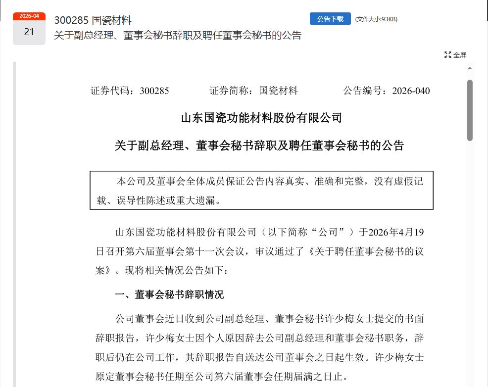 近日,据深圳证券交易所发布的《山东国瓷功能材料股份有限公司关于副总经理、董事会秘书辞职及聘任董事会秘书的公告》,山东国瓷功能材料股份有限公司(以下简称“国瓷材料”)召开第六届董事会第十一次会议,审议通过了原公司副总经理、董事会秘书许少梅的辞职申请,同时聘任胡俊为新任董事会秘书。