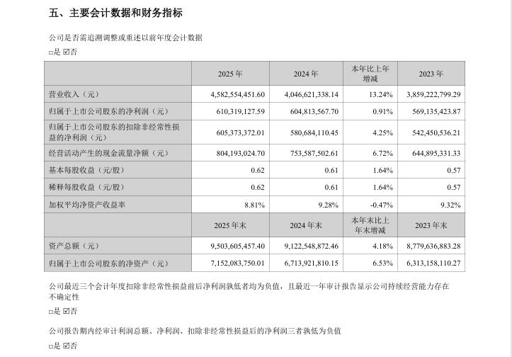 国瓷材料此次高管调整与2025年年度报告的发布几乎是同步的。据《山东国瓷功能材料股份有限公司2025年年度报告》,2025年,国瓷材料实现营业收入45.83亿元,同比增长13.24%;归母净利润6.1亿元,同比微增0.91%;扣非归母净利润6.05亿元,同比增长4.25%。