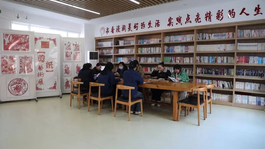 1月20日,在东营区黄河路街道兴河社区内,非遗剪纸爱好者赵萍(前排中)向社区居民传授剪纸技巧。近日,赵萍历时6个月创作完成了8 5米剪纸