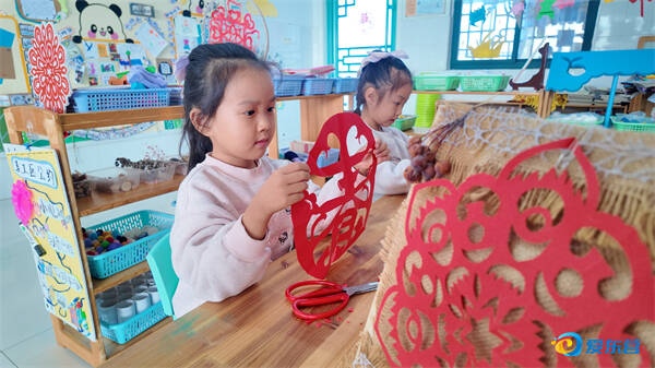 近日,在河口区义和镇中心幼儿园,大班的孩子们在老师的带领下体验剪纸技艺。为迎接新年,该幼儿园开展了丰富多彩的传统文化主题活动,小朋